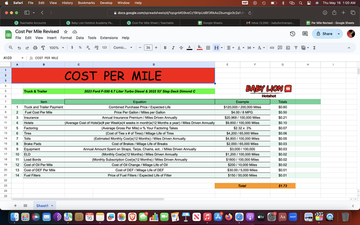 This is an example of exactly how I get to my cost per mile. First I show you my calculation then I have a blank sheet you can copy what I did with numbers that are true for your situation. For example if you spent 50K on your truck and I spent 80K don't put 80K as I did put your cost into the equation instead. I think you'll be able to figure it out pretty easy.